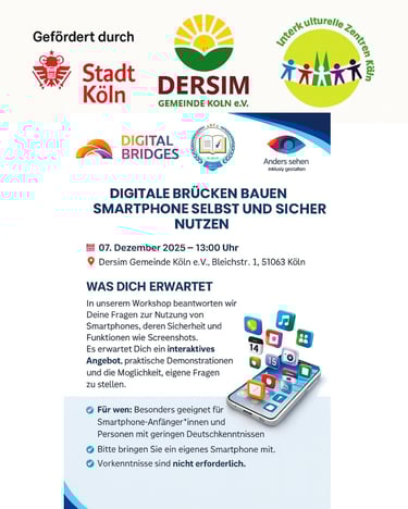 Im Workshop „Digitale Brücken bauen: Smartphone selbst und sicher nutzen“ werden grundlegende Fragen zur Nutzung von Smartphones beantwortet – von wichtigen Sicherheitsaspekten bis hin zu Funktionen wie Screenshots. Es erwarten euch interaktive Übungen, praktische Demonstrationen und Raum für individuelle Fragen.