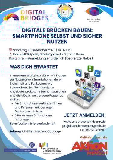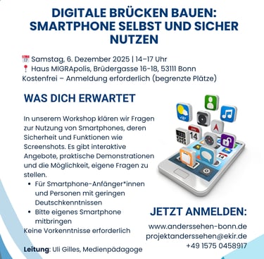 Im Workshop „Digitale Brücken bauen: Smartphone selbst und sicher nutzen“ werden grundlegende Fragen zur Nutzung von Smartphones beantwortet – von wichtigen Sicherheitsaspekten bis hin zu Funktionen wie Screenshots. Es erwarten euch interaktive Übungen, praktische Demonstrationen und Raum für individuelle Fragen.