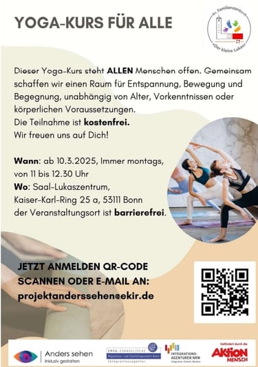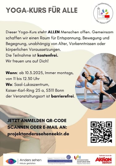 Dieser Yoga-Kurs steht ALLEN Menschen offen. Gemeinsam schaffen wir einen Raum für Entspannung, Bewegung und Begegnung, unabhängig von Alter, Vorkenntnisse oder