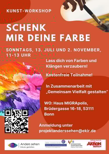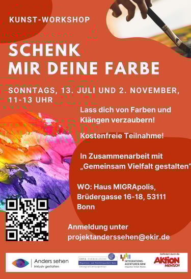 Lass dich von den harmonischen Klängen und lebhaften Farben verzaubern! In diesem kostenlosen Workshop, der für ALLE zugänglich ist – unabhängig von Alter, Geschlecht, Zuwanderungsgeschichte oder Behinderung – verwandeln wir kreative Ideen in strahlende Kunstwerke und zelebrieren eine farbenfrohe Ausstellung. Und das Beste: Die Teilnahme ist kostenfrei!